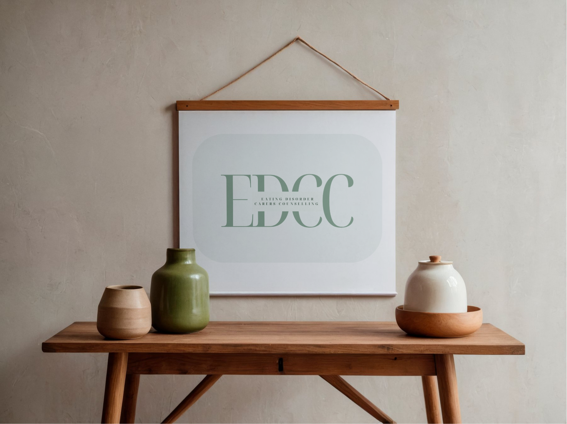 The EDCC logo was designed to balance strength with sensitivity. The oversized serif acronym “EDCC” creates a bold, confident foundation, establishing credibility and authority within the mental health space. In contrast, the full name ‘Eating Disorder Carers Counselling’ is set in a refined, widely spaced type treatment that softens the composition and introduces clarity and professionalism. The interplay between scale and spacing symbolises the relationship between carers and those they support, strength holding space for vulnerability. The muted sage green palette was intentionally selected to evoke calm, reassurance and growth, aligning with themes of healing and emotional safety. The overall minimal composition ensures the brand feels contemporary and trustworthy, allowing the organisation’s mission to remain the focus while the design quietly reinforces stability and care.