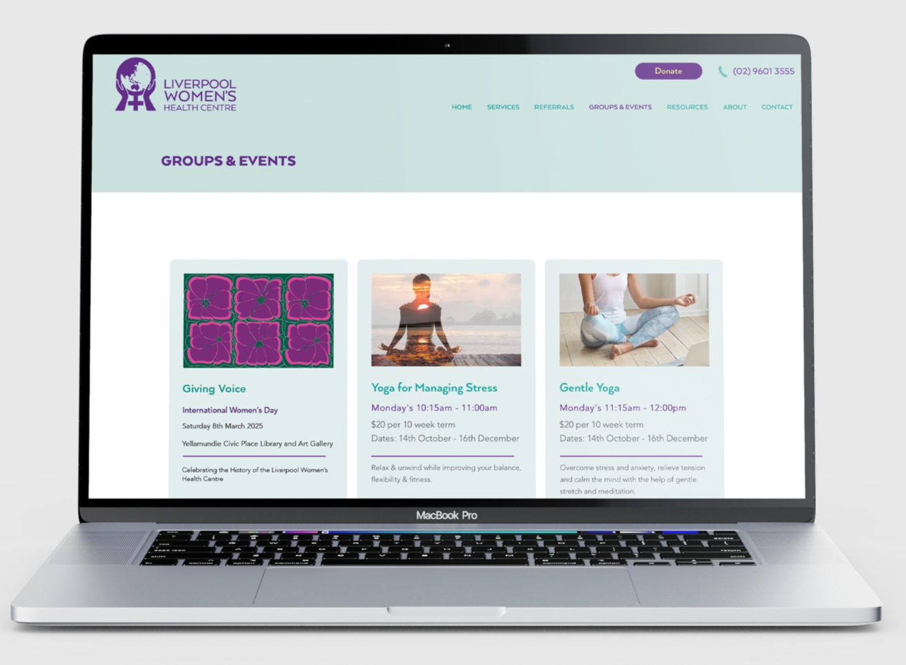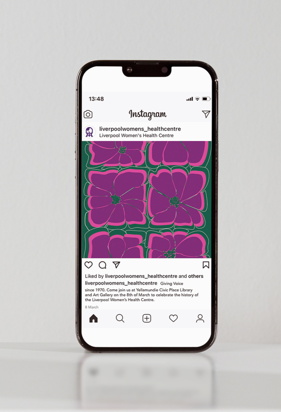 The hero graphic was adapted across the web mockups and the Liverpool Women’s Health Centre website to ensure a strong and cohesive digital presence. Designed with scalability in mind, the vector artwork translated seamlessly across screen sizes, maintaining clarity, colour integrity, and visual impact. Its placement within the web layouts helped anchor the exhibition content, drawing attention while supporting accessibility and ease of navigation. The result was a bold yet welcoming digital extension of the exhibition that reinforced the theme of Giving Voice within an online context.