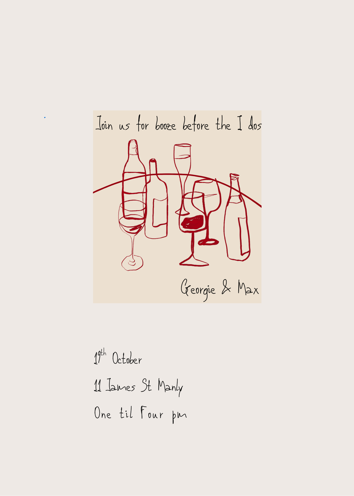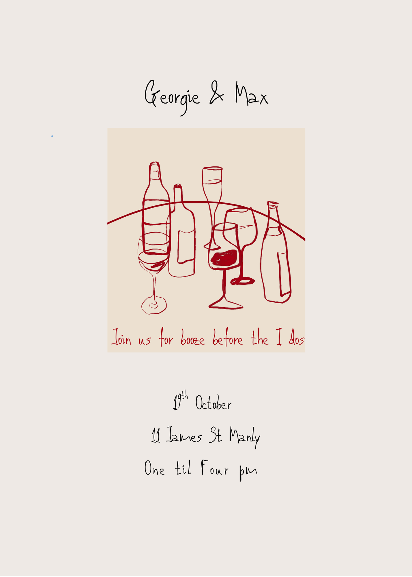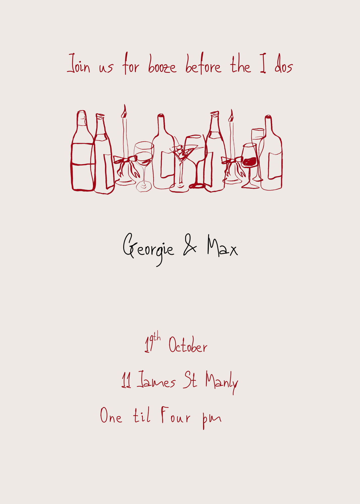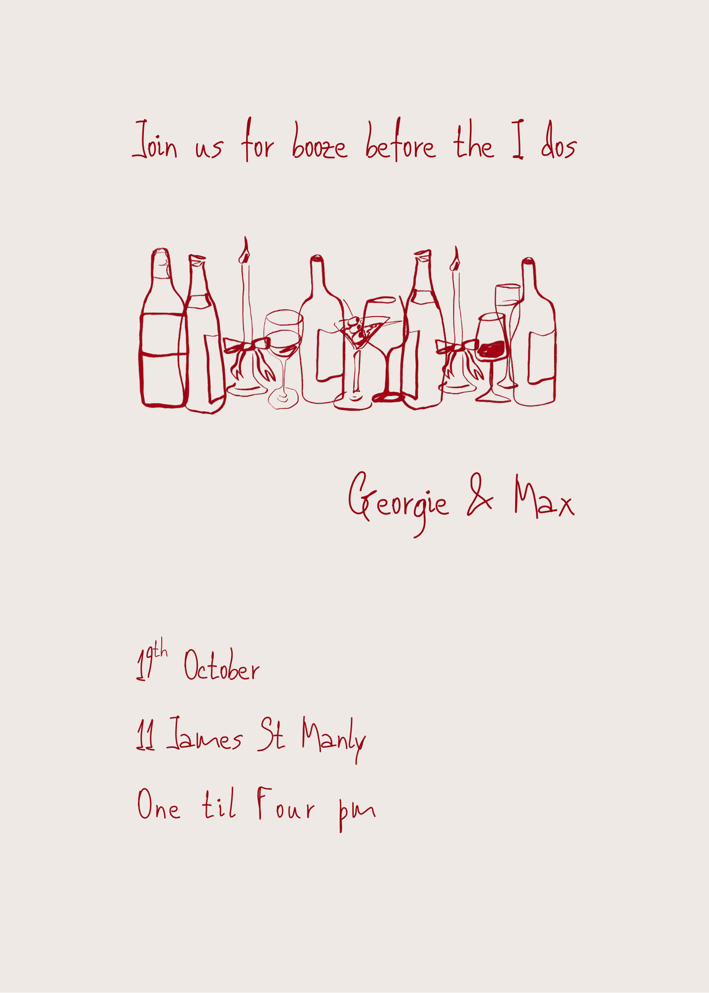 The invitation features a warm, neutral base paired with a soft red line illustration to create a sense of intimacy and informality. A simple, minimal layout allows the hand-drawn elements to remain the focal point, while handwritten-style typography complements the illustration and reinforces the authentic, personal feel. The playful tagline “Join us for booze before the I do’s” introduces a sense of humour and warmth, setting a relaxed, celebratory tone for the event.