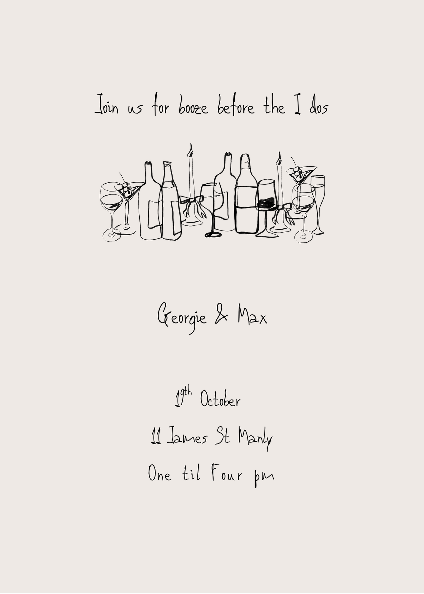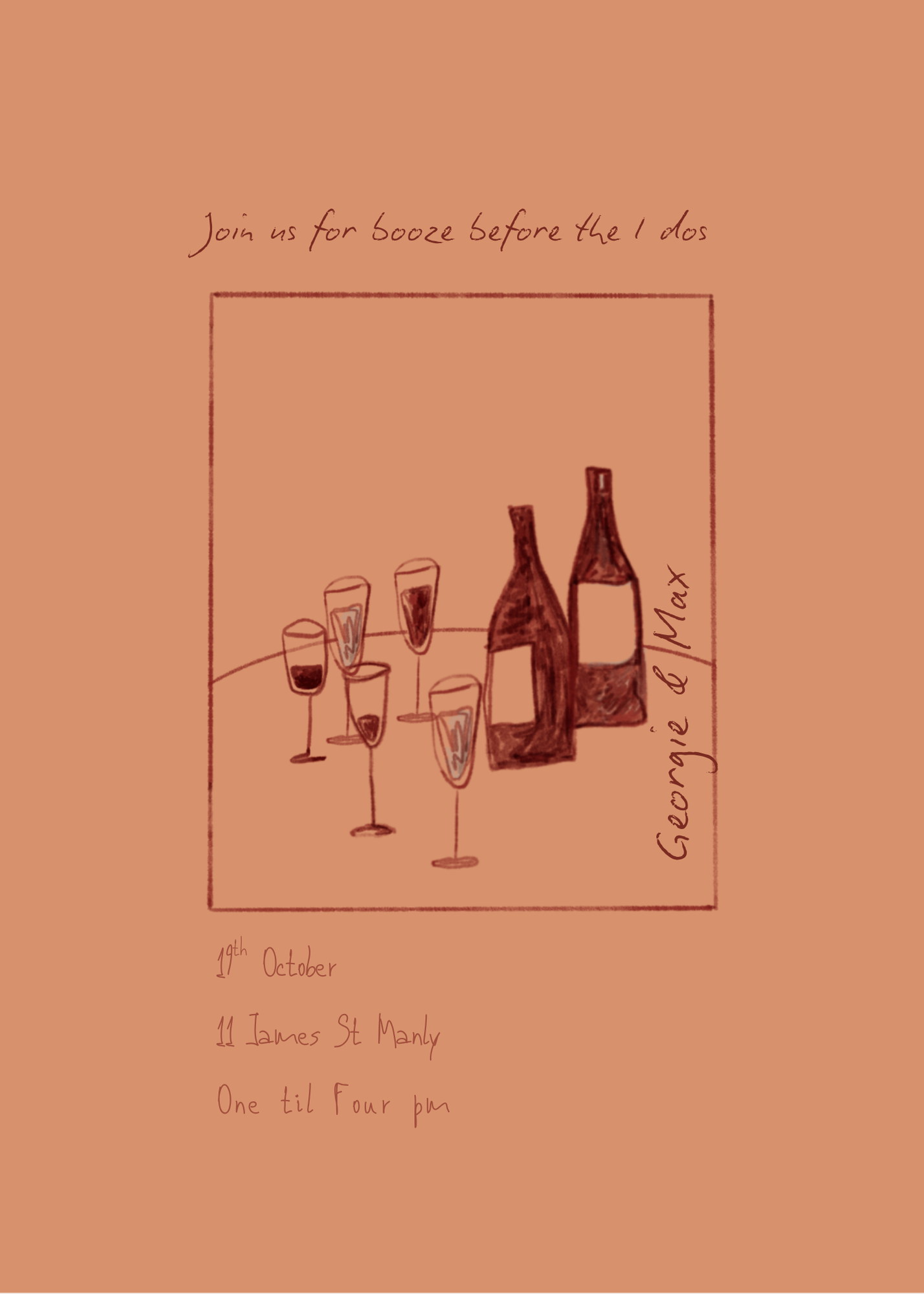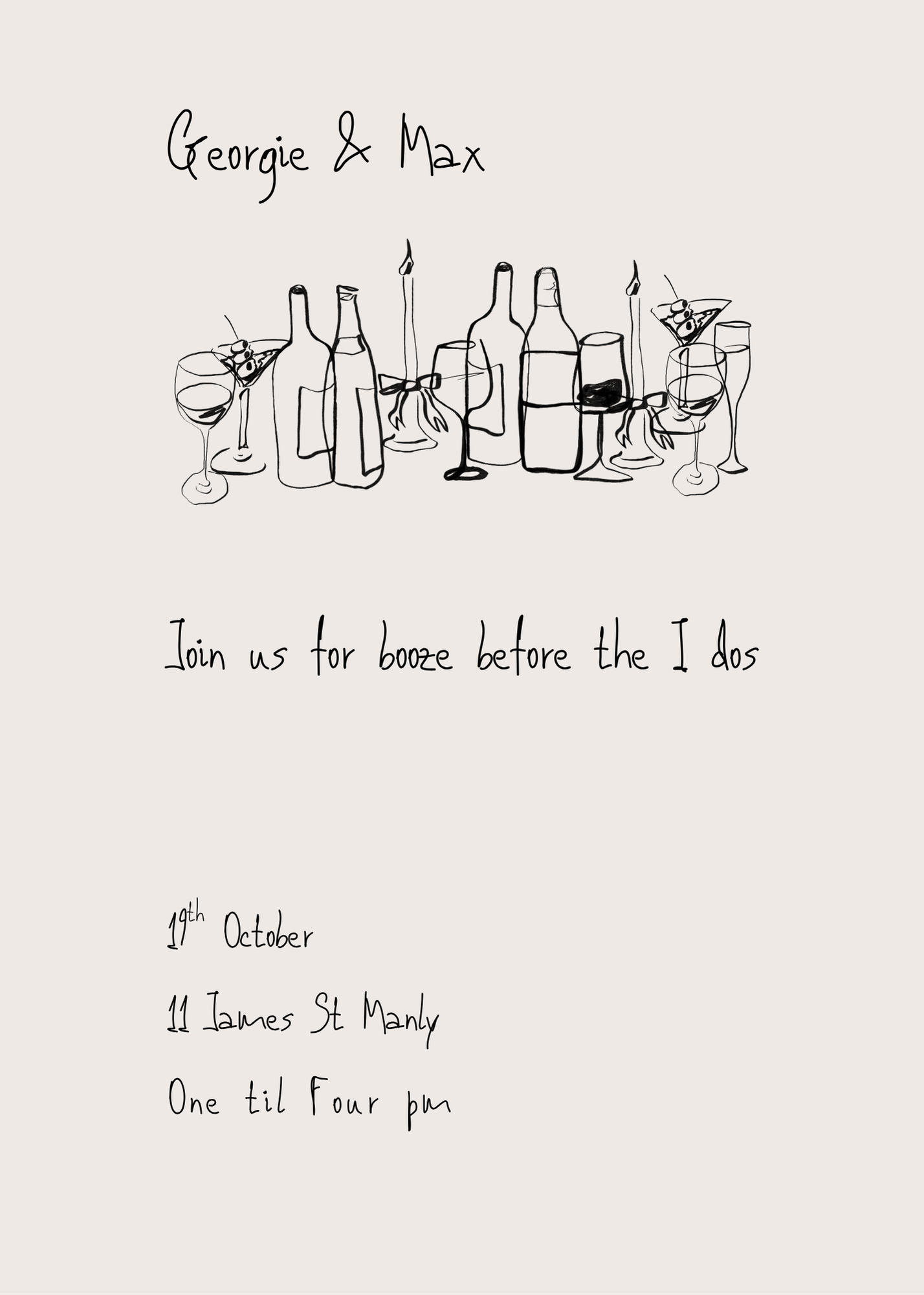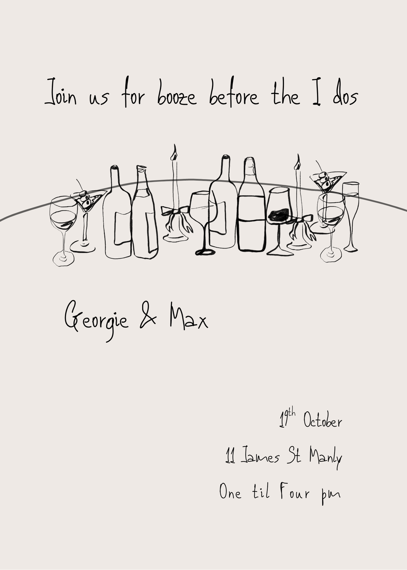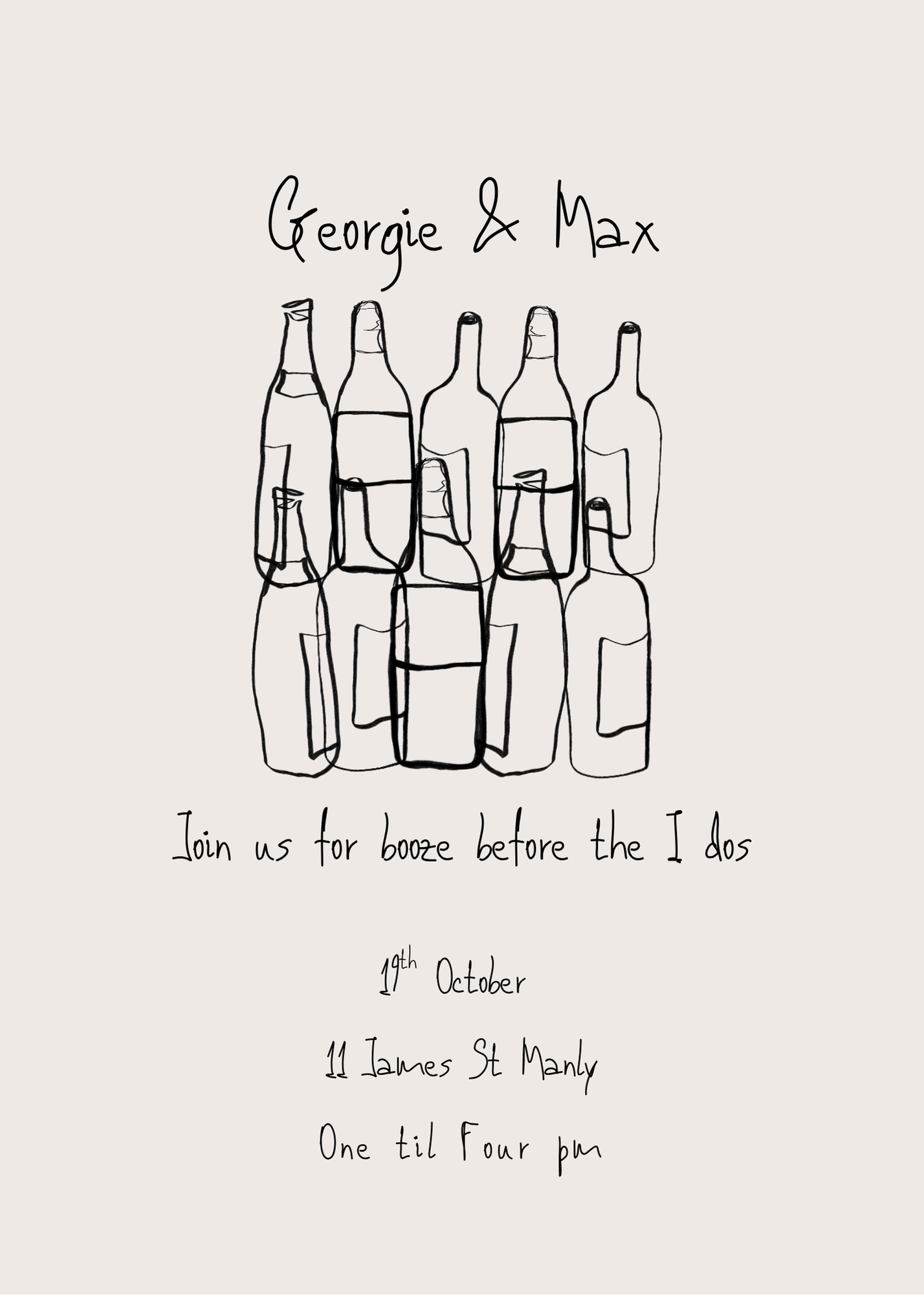 The invitation features a warm, neutral base paired with a soft red line illustration to create a sense of intimacy and informality. A simple, minimal layout allows the hand-drawn elements to remain the focal point, while handwritten-style typography complements the illustration and reinforces the authentic, personal feel. The playful tagline “Join us for booze before the I do’s” introduces a sense of humour and warmth, setting a relaxed, celebratory tone for the event.