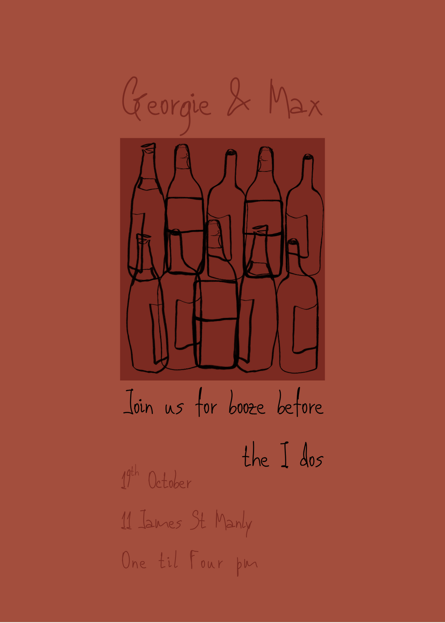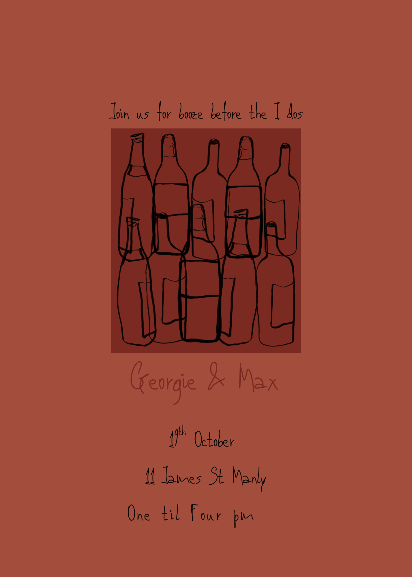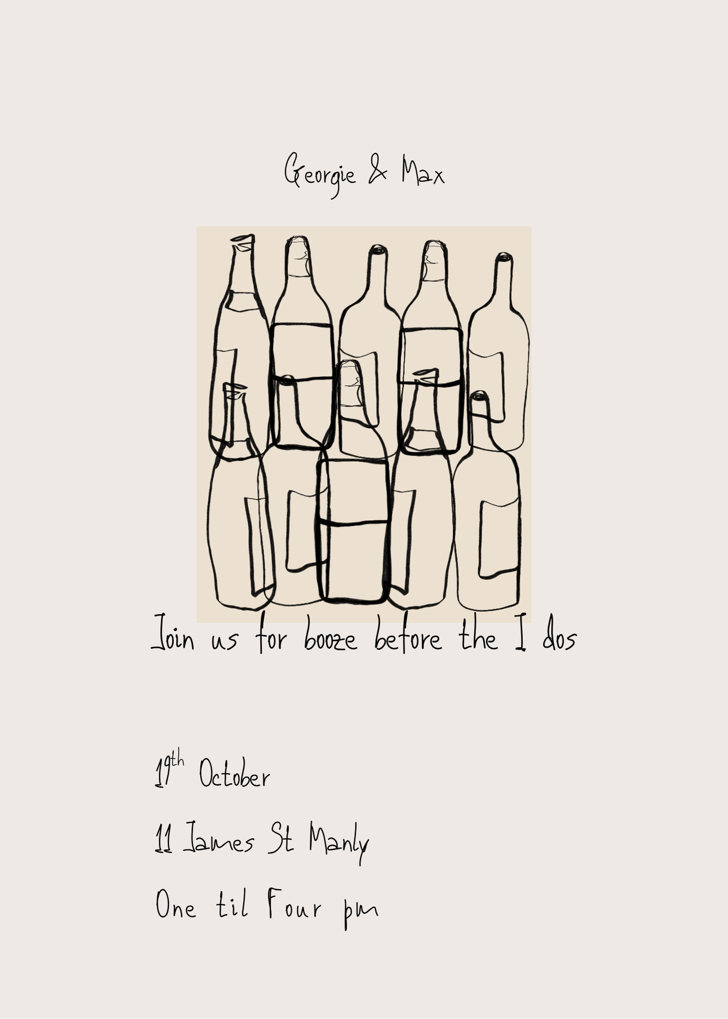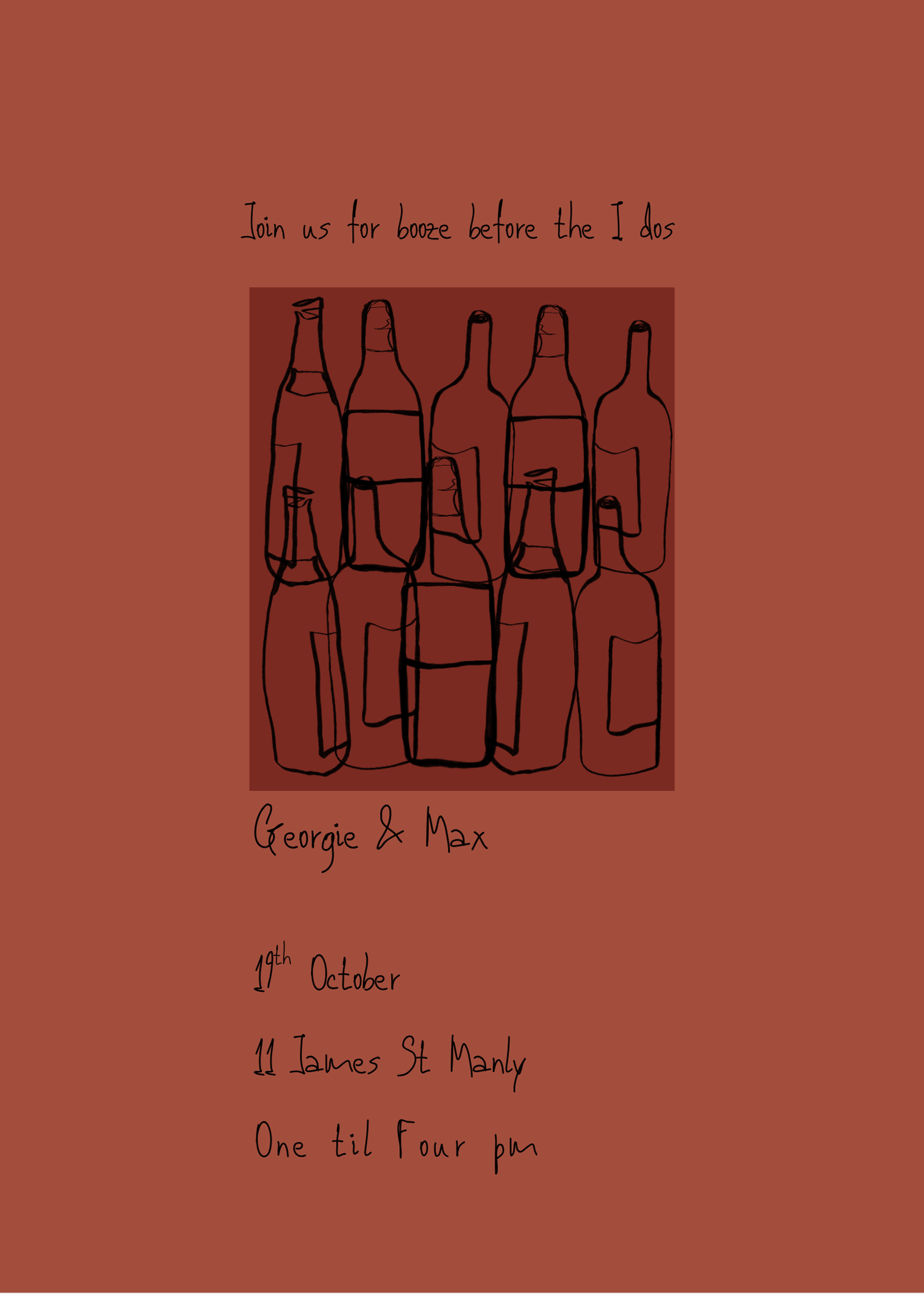 The invitation features a warm, neutral base paired with a soft red line illustration to create a sense of intimacy and informality. A simple, minimal layout allows the hand-drawn elements to remain the focal point, while handwritten-style typography complements the illustration and reinforces the authentic, personal feel. The playful tagline “Join us for booze before the I do’s” introduces a sense of humour and warmth, setting a relaxed, celebratory tone for the event.