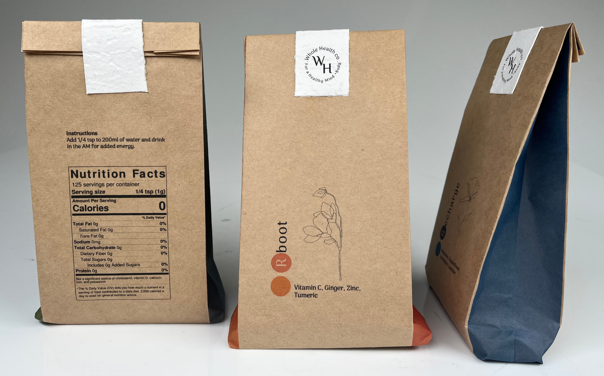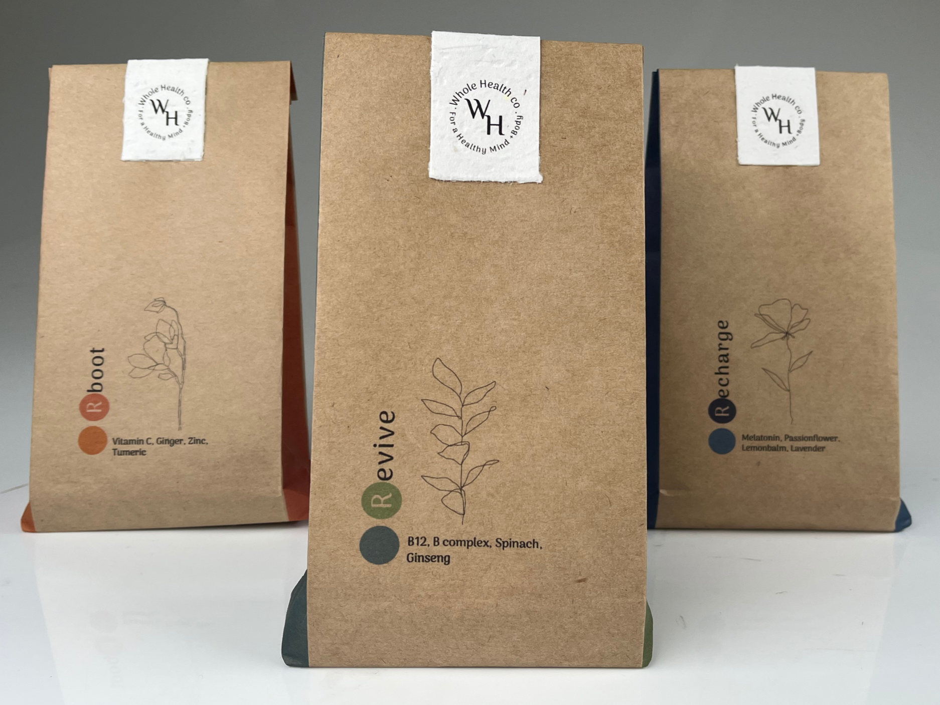 Reboot was developed as the immunity-support blend within the Whole Health Co range, formulated to strengthen and protect the body through nutrient-dense, anti-inflammatory ingredients. Combining Vitamin C and zinc to support immune function, alongside ginger and turmeric known for their natural anti-inflammatory and antioxidant properties, the blend is designed to help the body reset and defend itself during periods of stress or seasonal change. In alignment with the brand’s holistic philosophy, Reboot focuses on prevention and nourishment rather than quick fixes. The clean botanical illustration and warm accent tones reflect vitality and natural strength, while the minimalist packaging reinforces transparency and purity. Together, the formulation and visual identity embody Whole Health Co’s commitment to supporting long-term wellbeing through thoughtful, considered design.