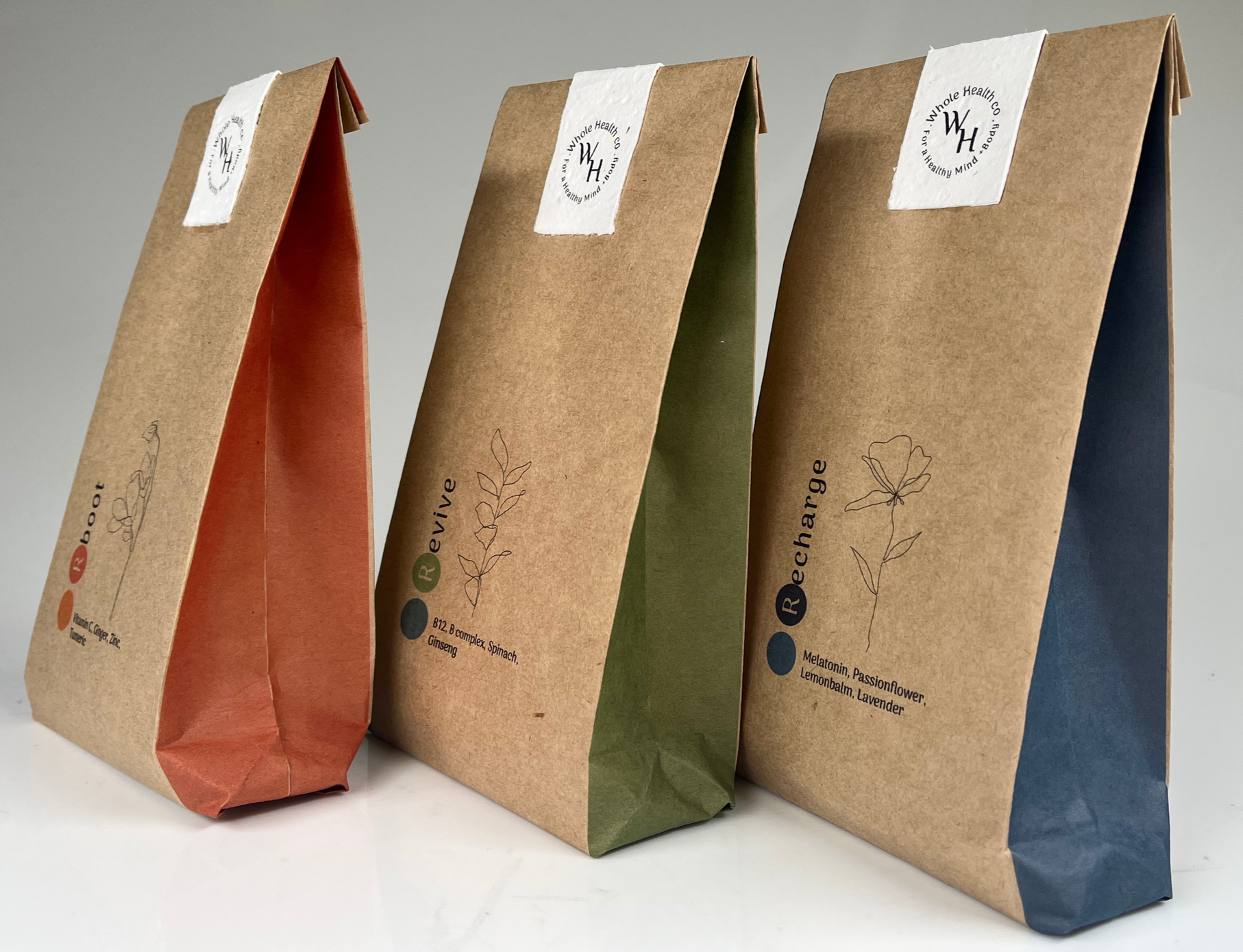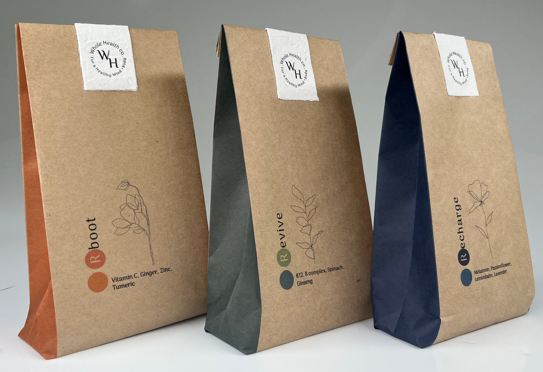 The packaging for Whole Health Co was intentionally handcrafted, with each form hand-folded to create a soft, structured silhouette that feels considered rather than mass-produced. This tactile construction reinforces the brand’s emphasis on care, intention and human connection within the wellness space. Each package features a contrasting internal seam colour, revealed subtly through the folds, creating a quiet moment of discovery when handled. These internal tones directly correspond with the two-toned circular markers on the exterior of each pack, visually linking the interior and exterior design. This detail-driven approach creates cohesion across the range while allowing each product to maintain its own identity, reflecting the balance between individuality and wholeness that underpins the Whole Health Co brand.
